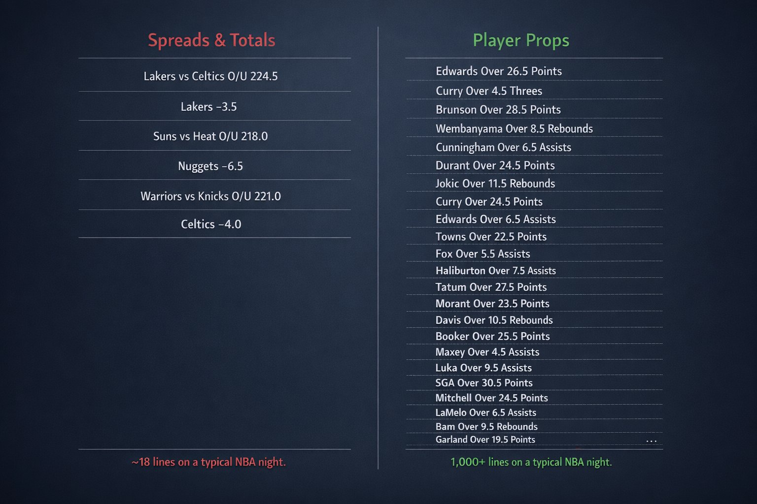 Player props vs spreads: ~18 main lines vs 1,000+ prop lines on a typical NBA night